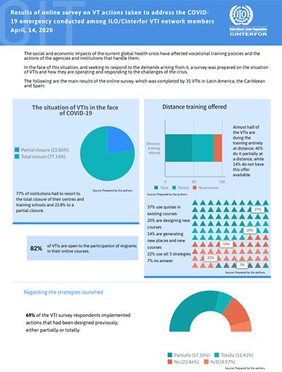 Infographic: results of the survey on the actions from the VT to face the emergency COVID-19 carried out to the VTI members of the ILO / Cinterfor network. Updated: April 2020
