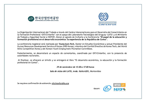 La Organización Internacional del Trabajo a través del Centro Interamericano para el Desarrollo del Conocimiento en la Formación Profesional -OIT/Cinterfor- con el apoyo del Laboratorio Tecnológico del Uruguay -LATU- y el Ministerio de Trabajo y Seguridad Social y el Instituto Nacional de Empleo y Formación Profesional - INEFOP-, organizó la Conferencia “El papel de la educación y formación profesional en el desarrollo económico: la experiencia de la República de Corea”.