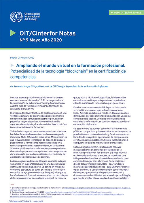 Ampliando el mundo virtual en la formación profesional. Potencialidad de la tecnología “blockchain” en la certificación de competencias. Nueva Nota OIT/Cinterfor